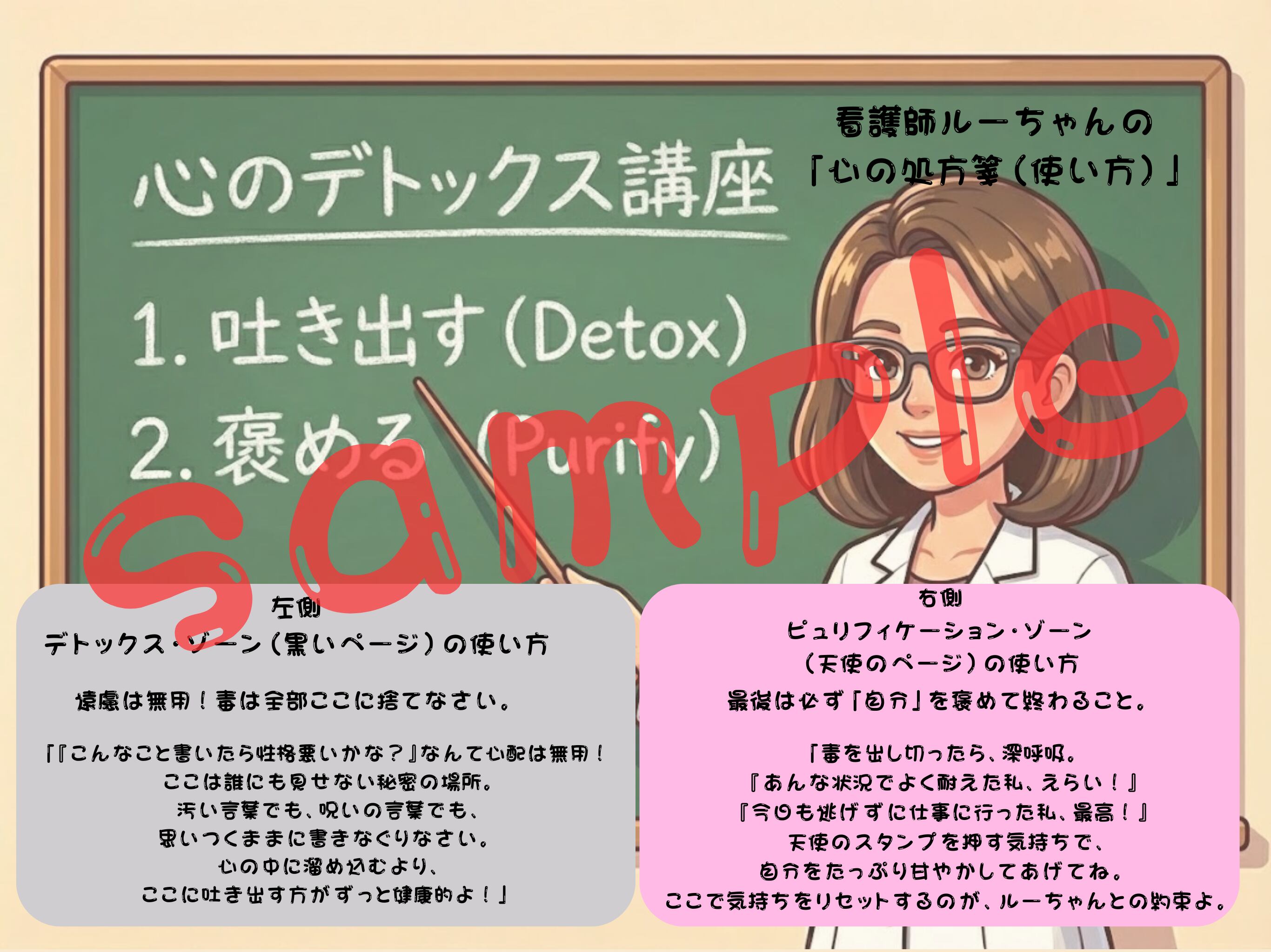 【天使の受領印】:吐き出した後に自分を褒め、スタンプを押して完了する(ピュリフィケーション)。 この「書いて、捨てて、認める」という一連の流れ(ワーク)が、この手帳の最大の機能です。